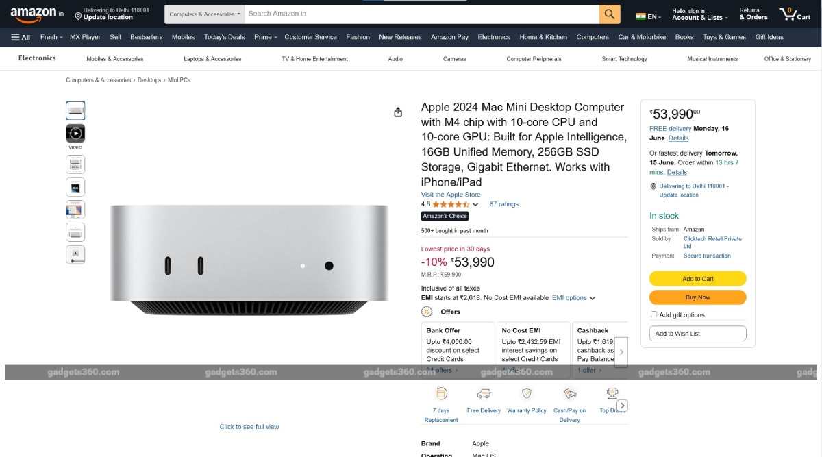 The Mac Mini with M4 chip is currently priced at Rs. 53,990 on Amazon, which is lower than its launch price of Rs. 59,990 (it is still selling at the same price on Apple’s website). Meanwhile, customers can also use an Axis Bank, ICICI Bank, or Kotak Bank credit card to avail of a Rs. 4,000 instant discount, which brings the effective price of the computer to Rs. 49,999.