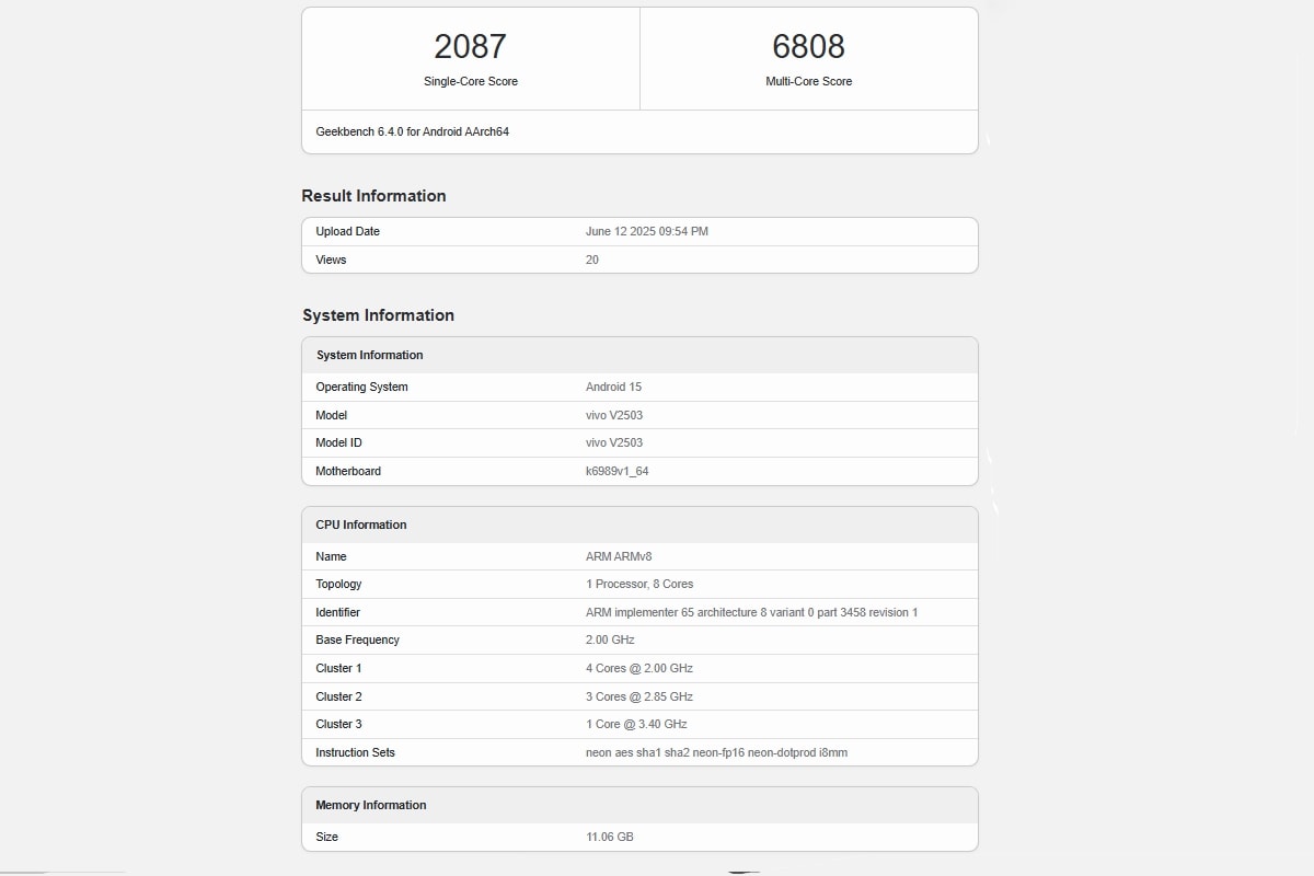 As per the listing, the Vivo X200 FE has an octa-core chipset with a one core clocked at 3.40GHz, four cores at 2.00GHz, and another three cores running at 2.85GHz. This configuration is associated with the MediaTek Dimensity 9300+ SoC. The site also shows that the phone has 11.06GB of memory, which should translate to 12GB RAM on paper.